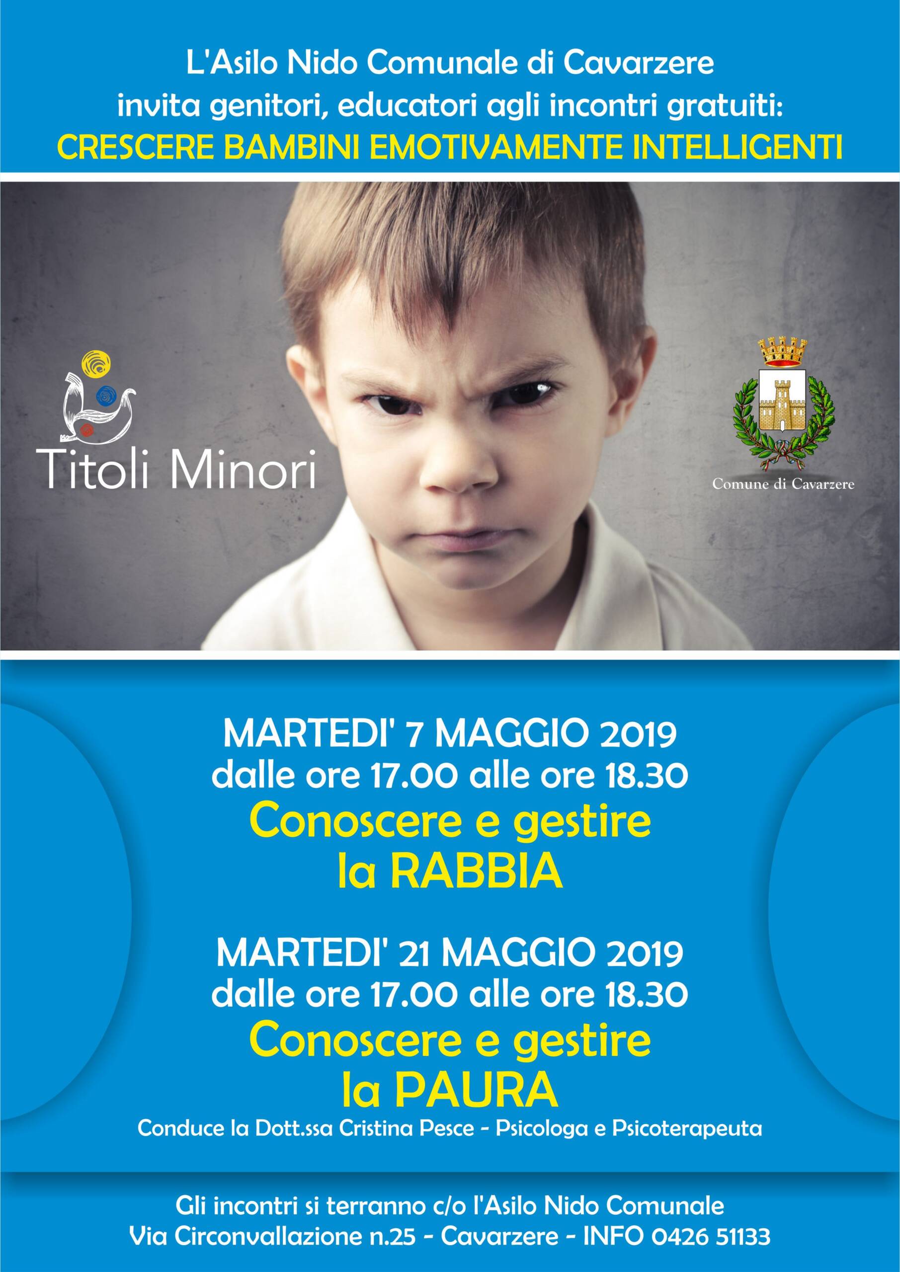 Questi due appuntamenti GRATUITI saranno condotti dalla Dott.ssa Cristina Pesce, Psicologa ePsicoterapeuta.