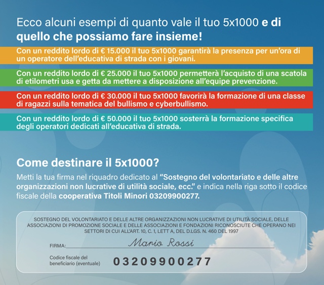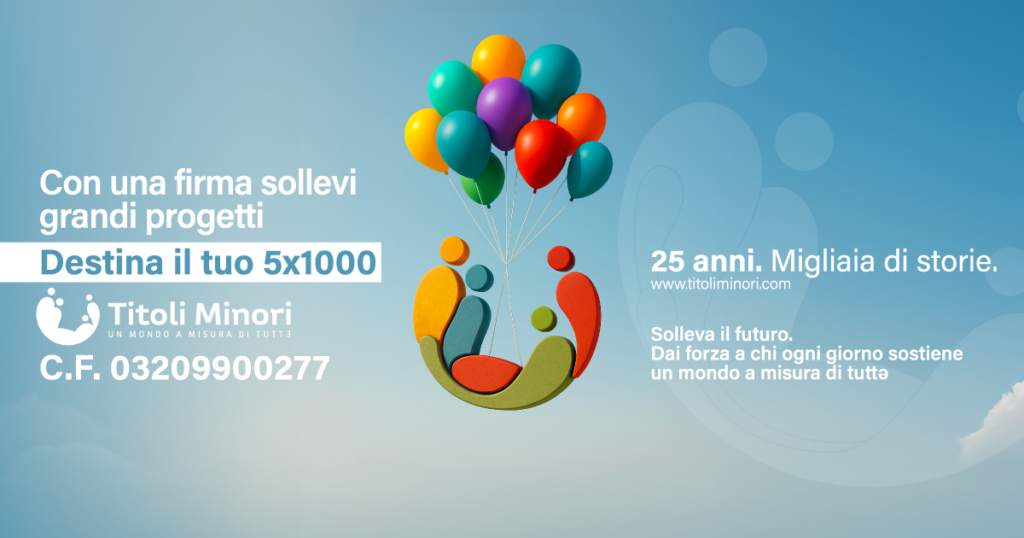 Il 5×1000 è un gesto semplice, gratuito, che può generare un impatto concreto nella vita di tante persone. Con la tua firma, puoi destinare il 5×1000 a Titoli Minori, contribuendo alla crescita di una comunità più inclusiva, attenta e solidale.